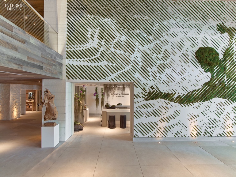 “From the second floor down, we gutted everything, even reconfiguring the street presence,” Gray Davis of Meyer Davis Studio says about the 1 Hotel Miami, a resort that stretches a full city block with 600 feet of Atlantic Ocean beachfront. On the ground floor, guests immediately encounter the property’s pièce de résistance—the lobby’s 20-by-30-foot mural of a swimmer, rendered in live moss growing through apertures in a white-painted wall. The architects collaborated with Plant the Future and arts collective 2Alas to make the green wall possible.